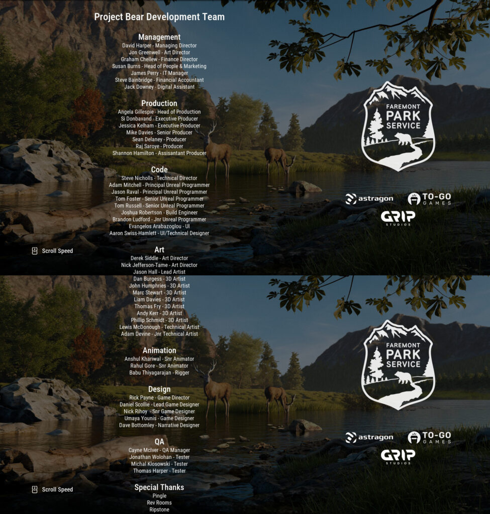 The team are credited under ‘Project Bear Development Team’ with myself credited as ‘Game Designer’.